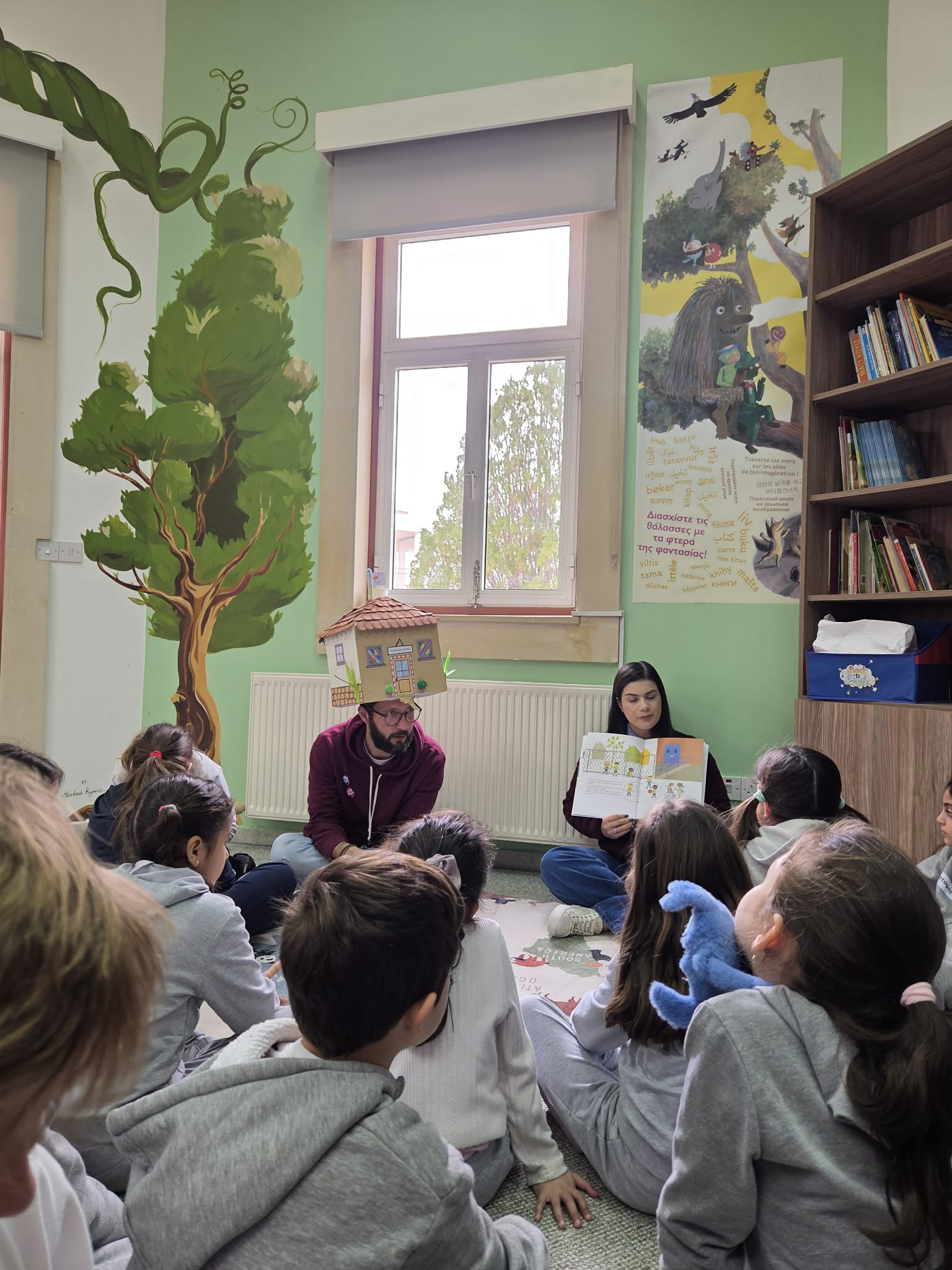 Η δράση ξεκίνησε με την ανάγνωση του βιβλίου «Το σχολείο πάει σχολείο» του συγγραφέα Adam Rex. Δύο εκπαιδευτικοί διάβασαν το βιβλίο στα παιδιά, ενώ παράλληλα πραγματοποιήθηκε συζήτηση και σχολιασμός των εικόνων και της ιστορίας.