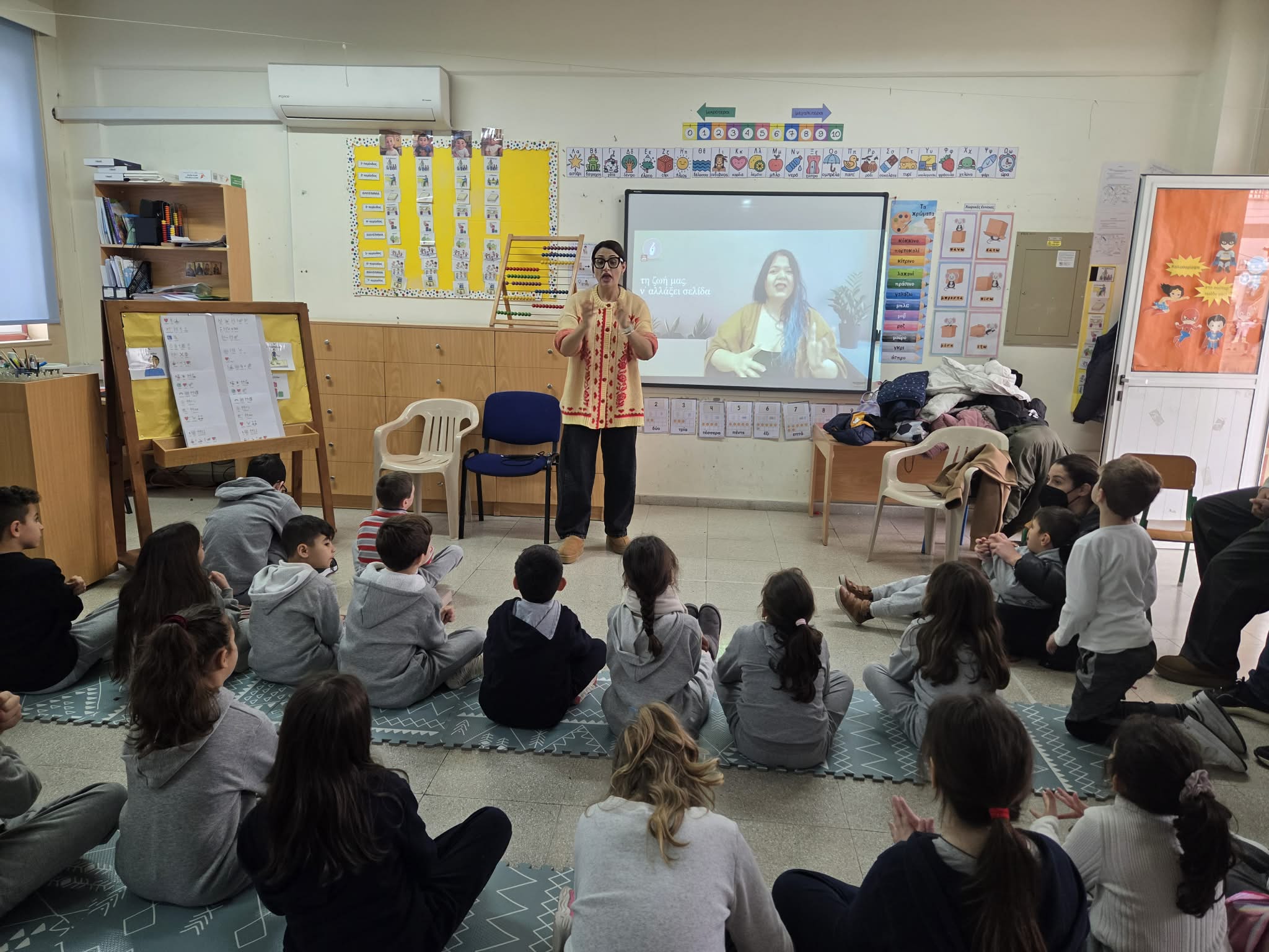Στη συνέχεια ακολούθησε συζήτηση για τη νοηματική γλώσσα. Τα παιδιά ενημερώθηκαν για το τι είναι η νοηματική, ποιοι τη χρησιμοποιούν και γιατί, ενώ αποσαφηνίστηκαν και κάποιες συχνές παρερμηνείες γύρω από αυτήν.
